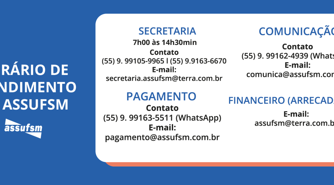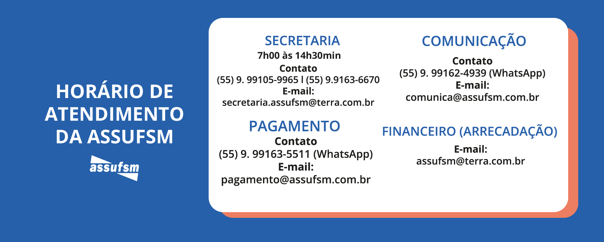 A secretaria responde também através dos contatos (55)9.9105-9965; (55)9.9163-6670; (55)3220-8123 e (55)3220-8385, além do e-mail secretaria.assufsm@terra.com.br.