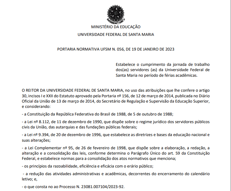 A portaria fica vigente para todos os períodos de férias acadêmicas da instituição, divulgadas no calendário acadêmico. De imediato, o horário reduzido poderá ser realizado de 4 de fevereiro de 2023 a 17 de março de 2023.