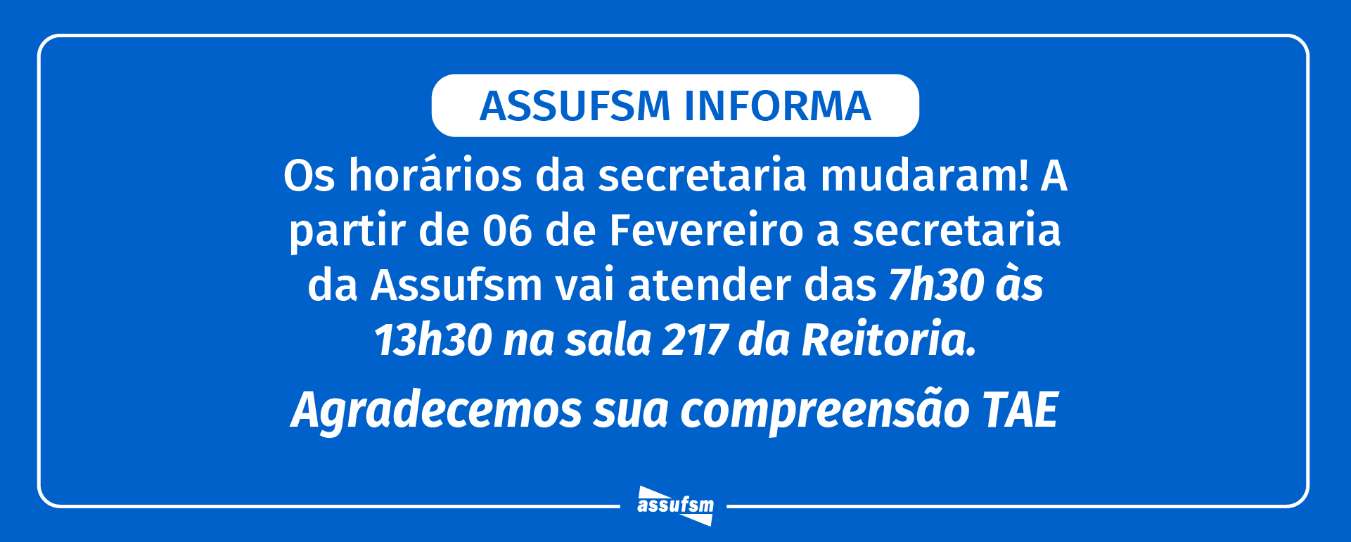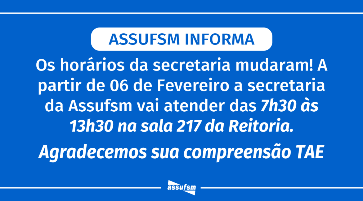 A Assufsm informa alterações de horário na Secretaria. A partir da próxima segunda-feira (6), as colaboradoras da Assufsm estarão atendendo de segunda à sexta-feira, das 7h30min às 13h30min, sem fechar ao meio-dia, na sala 217, no 2° andar do prédio da Reitoria.