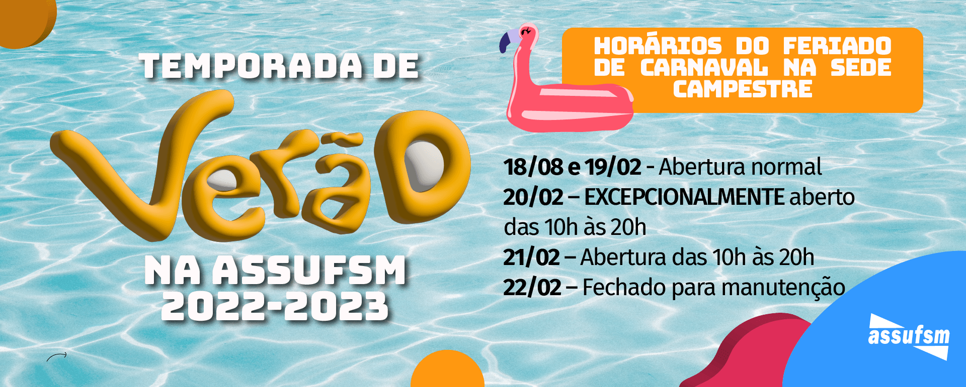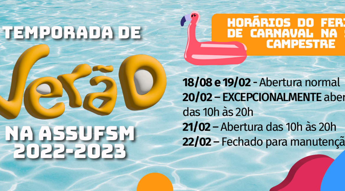 Já a Sede Campestre da Assufsm também terá alterações de horário. Excepcionalmente na segunda-feira, dia 20 de fevereiro, a Sede e as piscinas irão ABRIR ao público, das 10h às 20h.