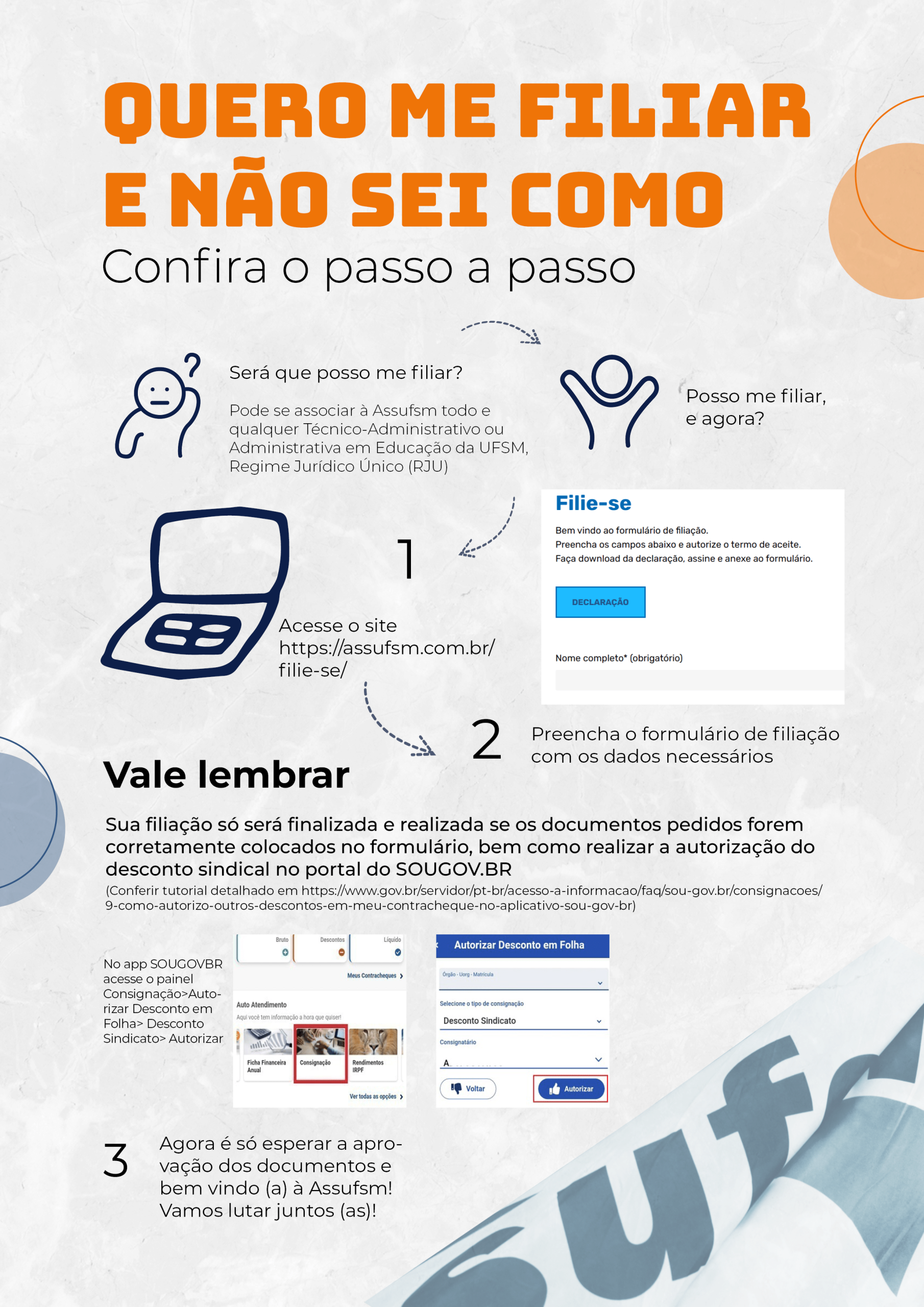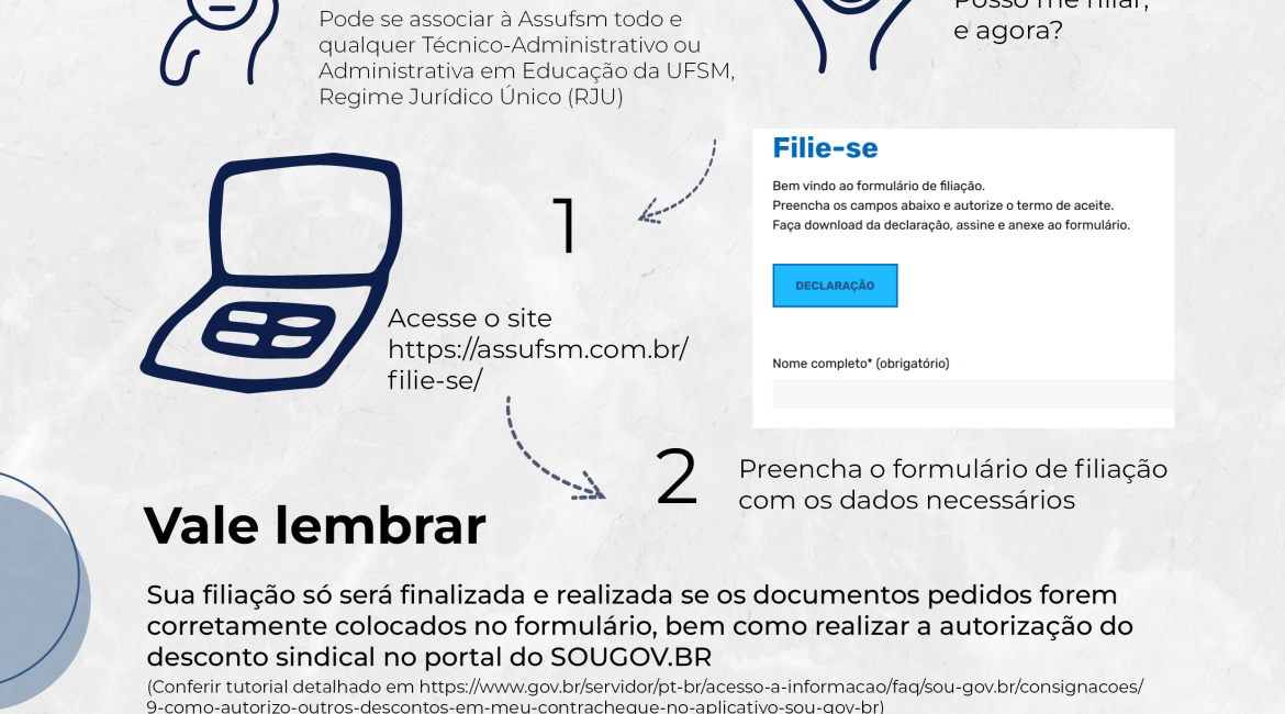 A fim de agilizar o processo de filiação, a Assufsm disponiliza um questionário de forma virtual que deve ser respondido de forma completa. Para auxiliar as e os TAES interessados/as, lançamos um tutorial explicativo.