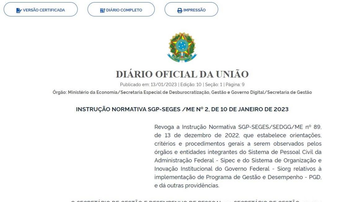 No último dia 13 de janeiro de 2023, foi publicada INSTRUÇÃO NORMATIVA (IN) SGP-SEGES /ME Nº 2, DE 10 DE JANEIRO DE 2023, que revoga a última Instrução Normativa que disciplinava sobre o Programa de Gestão, a IN nº 89, de 13 de dezembro de 2022.