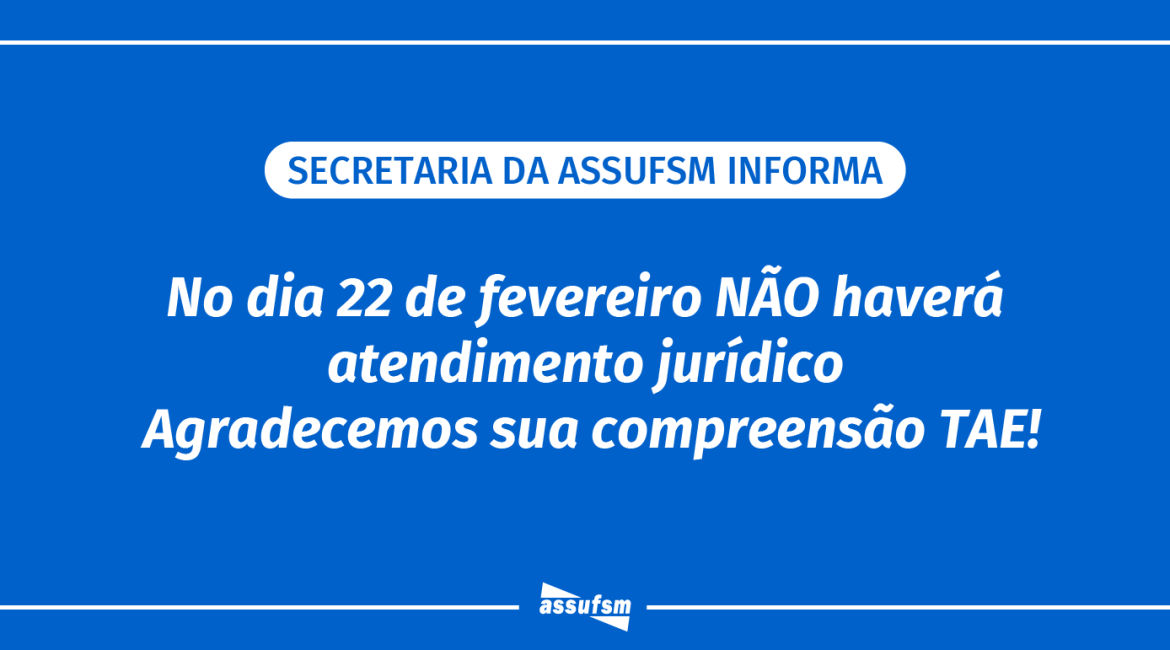 Quarta-feira é o tradicional dia de Plantão Jurídico na Assufsm, com atendimentos do escritório Wagner Advogados. No entanto, em razão do feriado de Carnaval, informamos que, na próxima semana (22), a agenda estará fechada e não serão realizados atendimentos. Além disso, neste dia, o Espaço Sindical com informes jurídicos para a categoria não será transmitido nas ondas dos 800AM da Rádio Universidade.