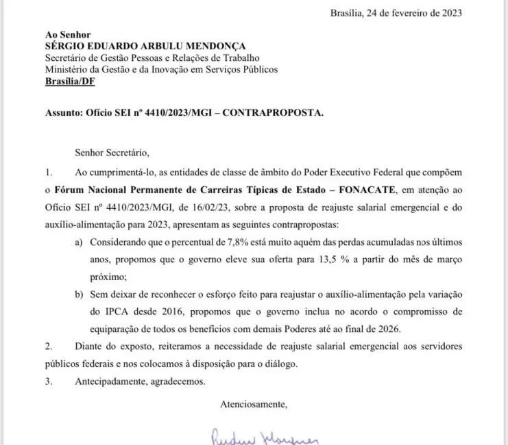 No ofício protocolado para o secretário de Gestão de Pessoas e de Relações de Trabalho do Ministério da Gestão e da Inovação em Serviços Públicos (MGI), Sérgio Mendonça, as entidades destacam que o percentual de 7,8% está muito aquém das perdas acumuladas nos últimos anos, e propõem que o governo eleve sua oferta para 13,5 % a partir do mês de março próximo.