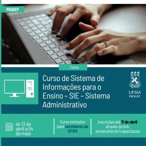 A Pró-Reitoria de Gestão de Pessoas (Progep) informa que estão abertas as inscrições para o Curso de Sistema de Informações para o Ensino – SIE – Sistema Administrativo, o qual tem como objetivo capacitar os servidores da UFSM para trabalhar elementos da Gestão Administrativa no SIE, utilizando os recursos computacionais disponíveis de software.