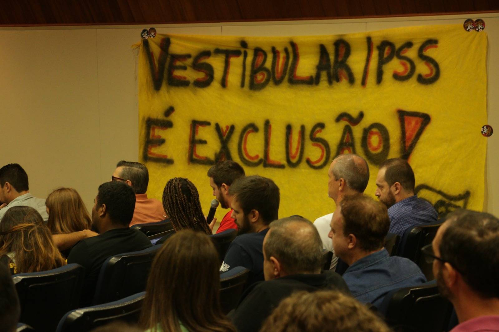 Na última terça-feira (4), representantes de movimentos estudantis e sindicais reuniram-se com o Reitor, no Espaço Multiuso, para expor os motivos pelos quais as entidades são contrárias à volta do vestibular e do Processo Seletivo Seriado (PSS).