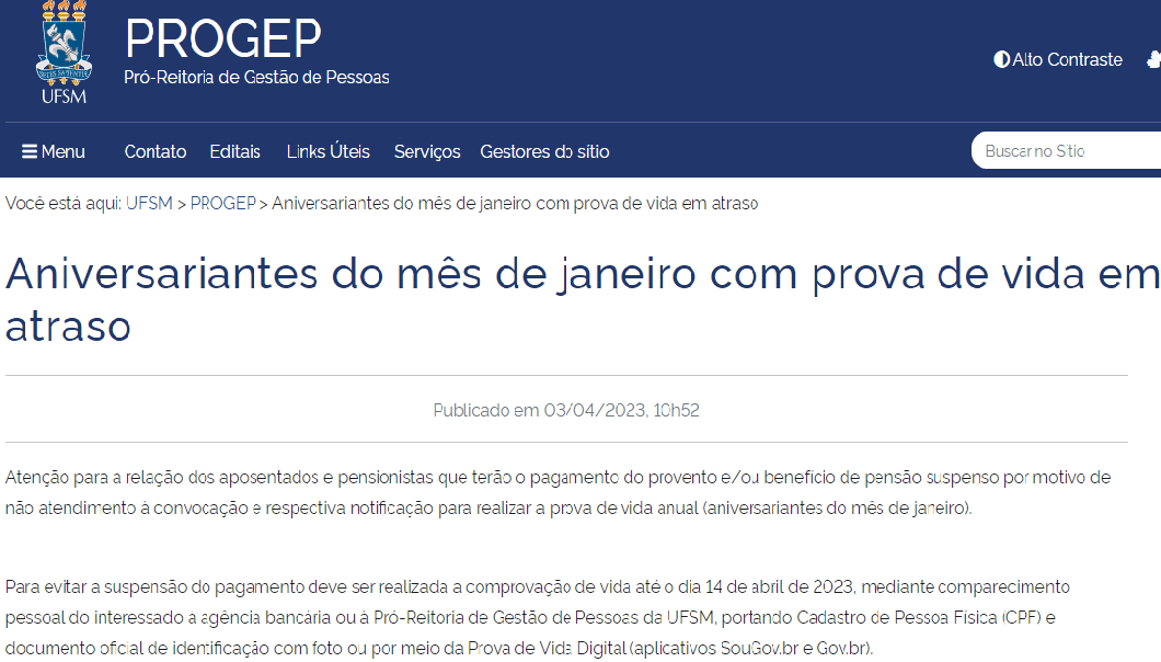 Para evitar a suspensão do pagamento deve ser realizada a comprovação de vida até o dia 14 de abril de 2023, mediante comparecimento pessoal do interessado à agência bancária ou à Pró-Reitoria de Gestão de Pessoas da UFSM, portando Cadastro de Pessoa Física (CPF) e documento oficial de identificação com foto ou por meio da Prova de Vida Digital (aplicativos SouGov.br e Gov.br).
