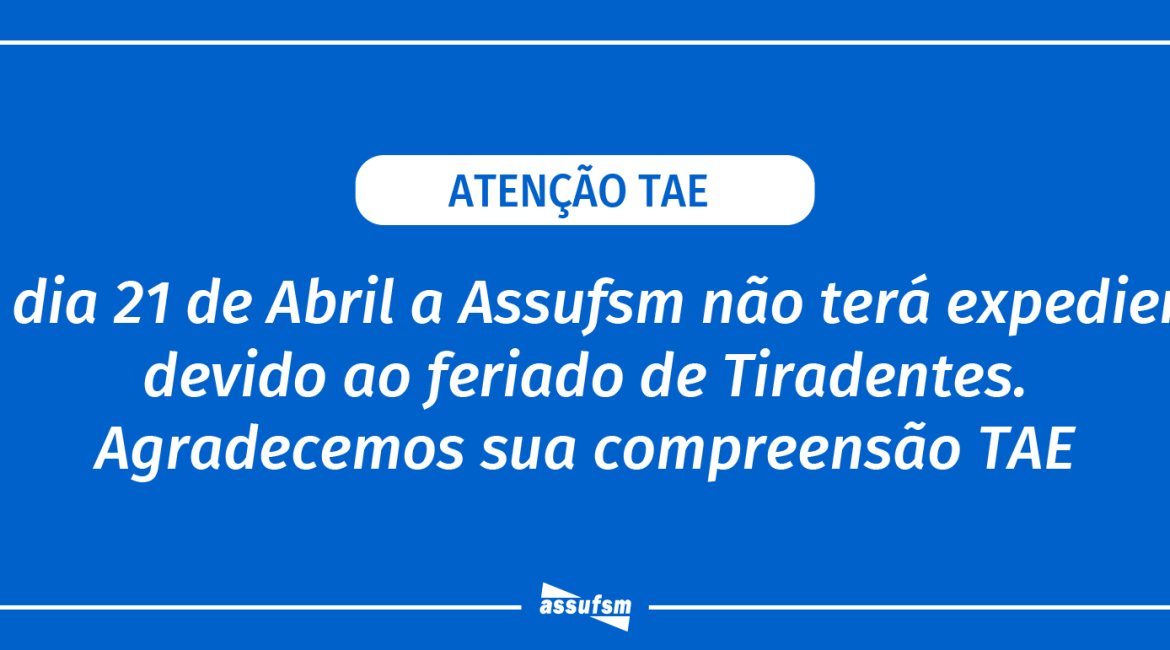TAE, atenção. No dia 21 de abril, a Assufsm não terá expediente devido ao feriado de Tiradentes.
