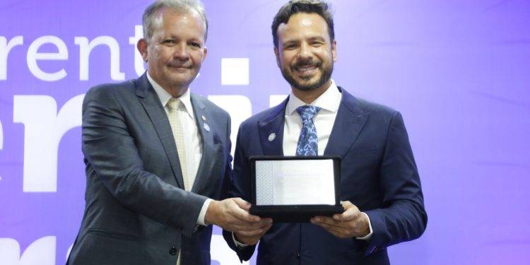 O deputado federal André Figueiredo foi responsável por entregar a placa de homenagem ao Professor Israel Batista, em um gesto de agradecimento e reconhecimento pelos anos de dedicação à causa pública.