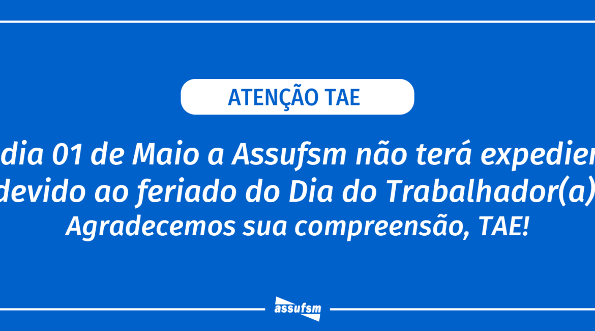 TAE, atenção. No dia 1º de maio, a Assufsm não terá expediente devido ao feriado do Dia do Trabalhador(a).