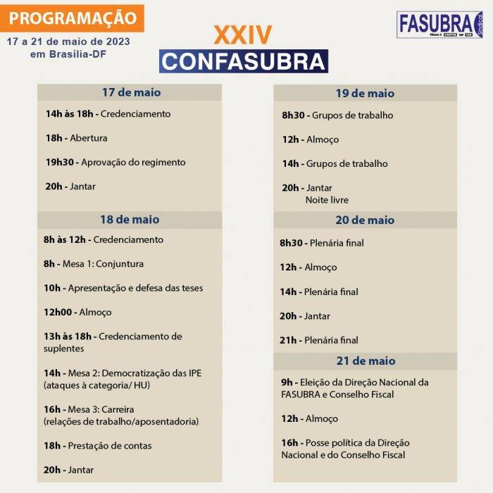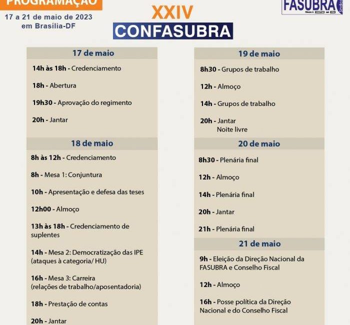 A abertura do XXIV CONFASUBRA acontece na quarta-feira (17/5), às 18h, e contará com a presença de sindicalistas, autoridades e parlamentares. Das 14h às 18h será realizado o credenciamento e, às 19h30, a aprovação do regimento interno.