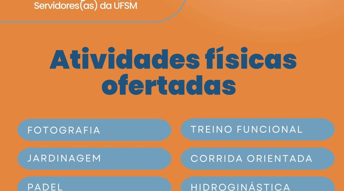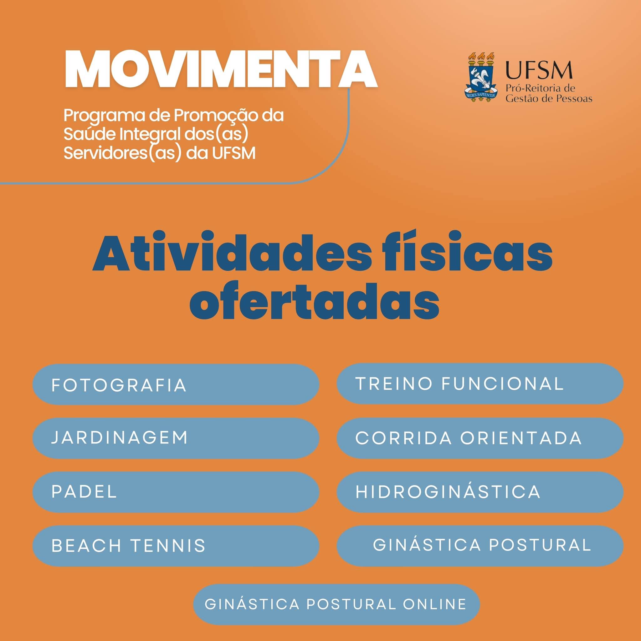 A Pró-Reitoria de Gestão de Pessoas informa que irá (re)abrir as inscrições para oficinas do Movimenta: Programa de Promoção da Saúde Integral dos(as) Servidores(as) da UFSM, que tem como objetivo central estimular e oportunizar o cuidado da saúde física e mental dos(as) servidores(as), por meio de práticas e oficinas multidisciplinares.