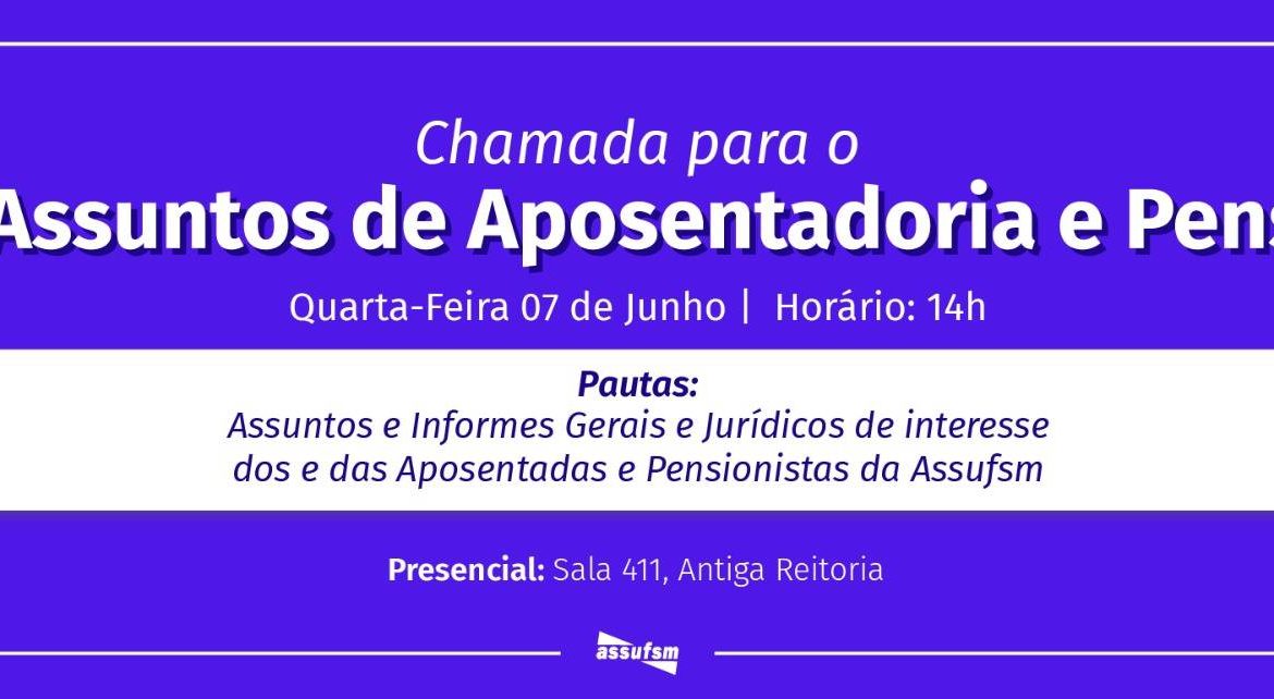 O Grupo de Trabalho (GT) Assuntos de Aposentadoria e Pensão está com suas atividades em pleno funcionamento e já divulga a data do encontro do mês de junho: quarta, dia 7, às 14h.