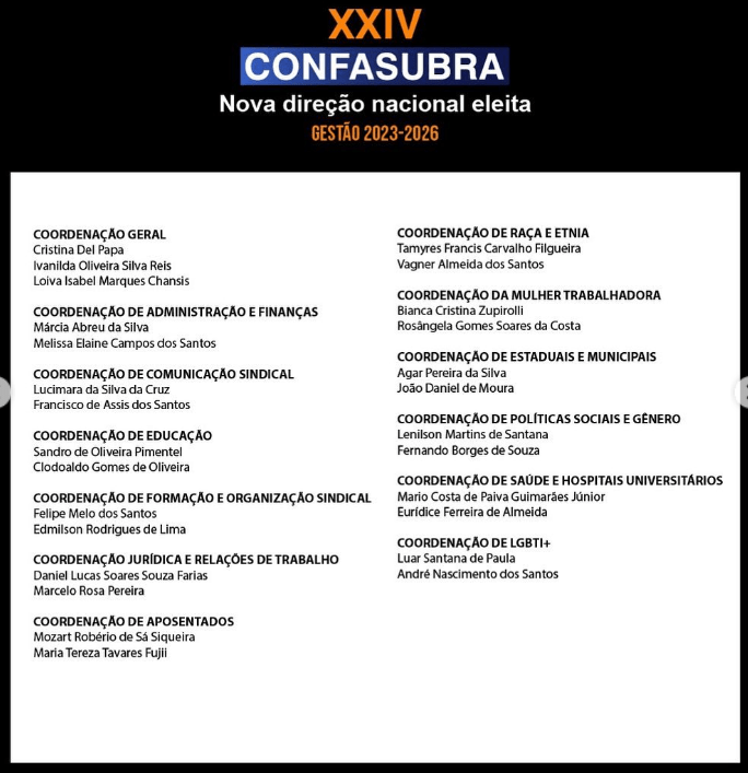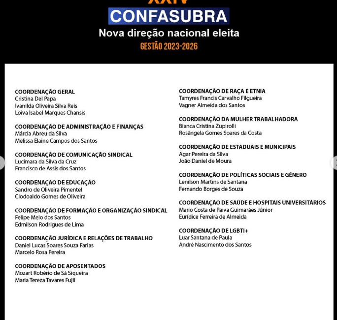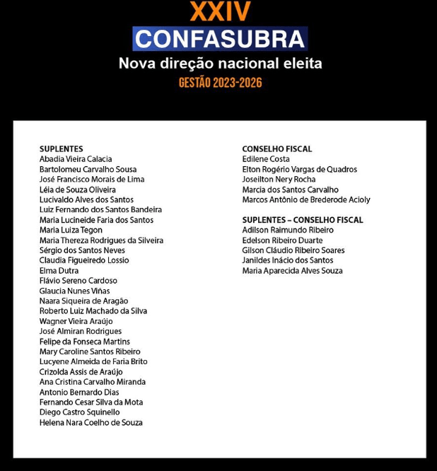Confira os nomes da nova direção eleita no XXIV CONFASUBRA para a gestão de 2023-2026: