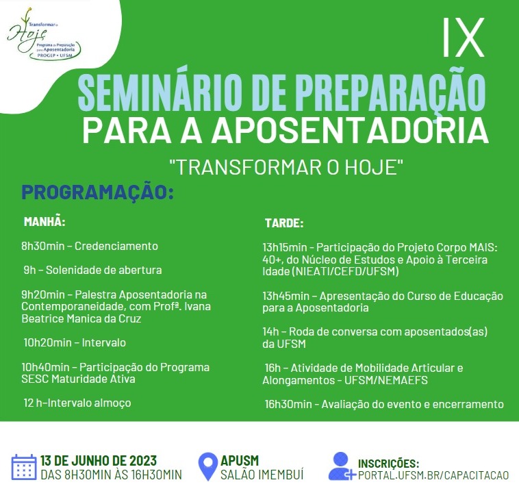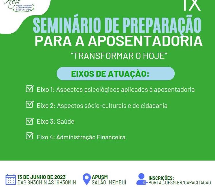 A Pró-Reitoria de Gestão de Pessoas informa que estão abertas as inscrições para o IX Seminário de Preparação para a Aposentadoria. O seminário tem como objetivo promover o Programa “Transformar o Hoje” a partir das ações previstas em seus quatro eixos de atuação: aspectos psicológicos aplicados à aposentadoria, aspectos sócio culturais e de cidadania, saúde e administração financeira.