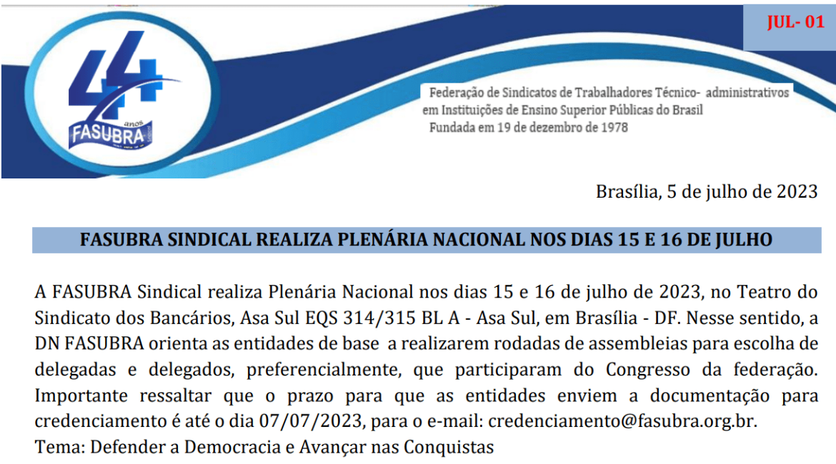 A FASUBRA Sindical lançou, no dia 5 de julho, o Informe de Direção de número 1 com atualizações e orientações sobre a Plenária Nacional, que ocorrerá nos dias 15 e 16 de julho, proposta da Campanha Salarial de 2024, campanha Brasil Participativo e o tradicional calendário de lutas.