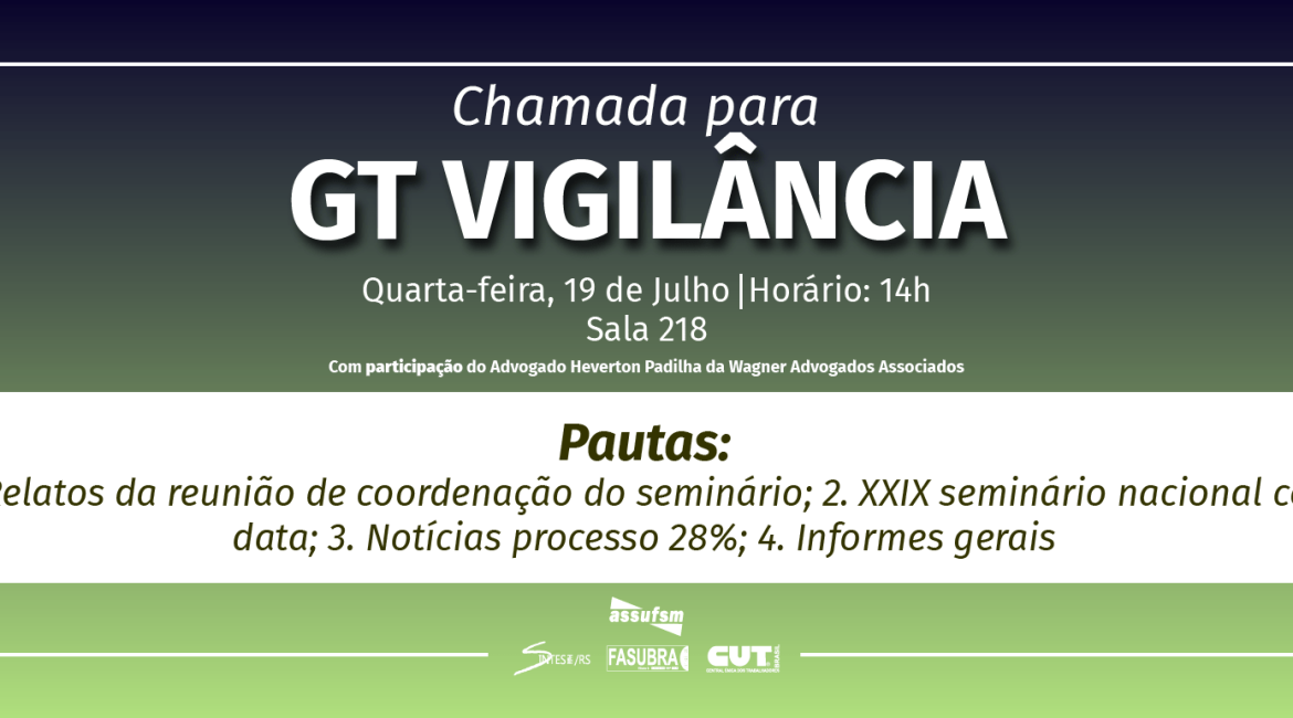O Grupo de Trabalho (GT) Vigilância da Assufsm está chamando a categoria de Técnico Administrativos(as) em Educação Vigilantes para debater pautas importantes à esse grupo.