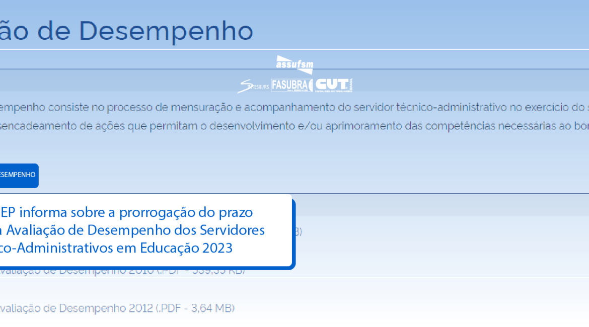 A UFSM, por meio da Pró-Reitoria de Gestão de Pessoas (PROGEP), informa que foi prorrogado até 18 de agosto de 2023 o período para a Avaliação de Desempenho de 2023. O período a ser avaliado pelos servidores é referente a 28 de fevereiro de 2022 até 28 de fevereiro de 2023.