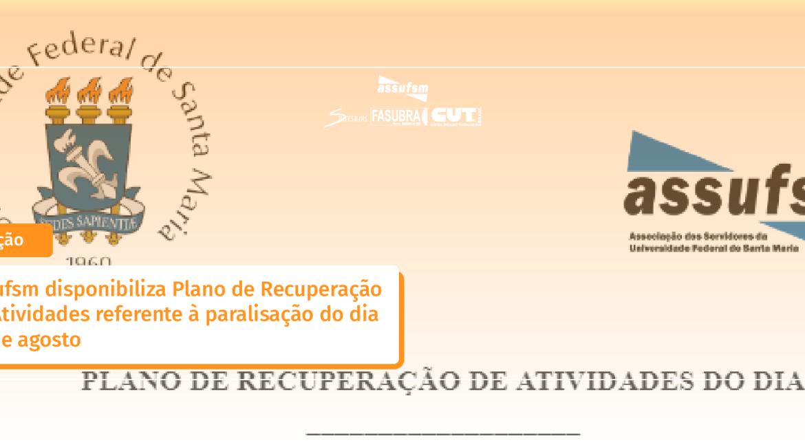 A Assufsm orienta aos/às Técnico Administrativas em Educação da UFSM que aderirem à paralisação do dia 30 de agosto, que preencham o Plano de Recuperação de Atividades, conforme acordo assinado pelo sindicato com a gestão da Universidade, em 18 de abril de 2022.