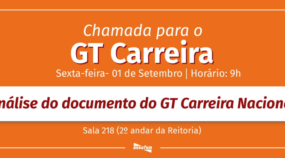 A Assufsm convoca, com urgência, o GT Carreira local no dia 1º de setembro, às 9h, na sala 218, no segundo andar do prédio da Reitoria.