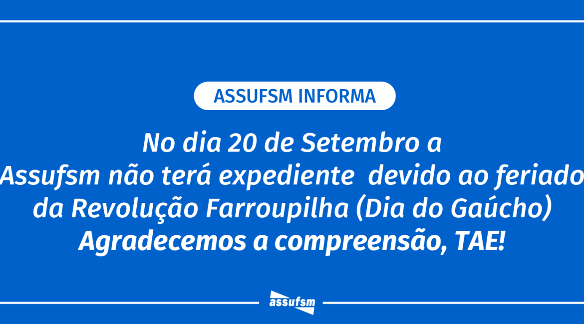 Devido ao feriado do Dia do e da Gaúcha, a Assufsm informa que não terá expediente na quarta-feira, dia 20 de setembro.