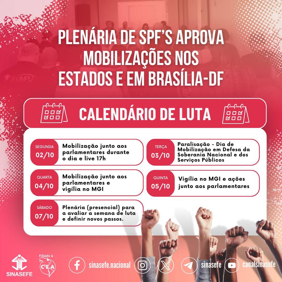 Após a escolha, a Assembleia seguiu no debate do calendário de lutas, organizado em Plenária do Fonasefe com entidades sindicais, ocorrida no dia 16 de setembro. Decidiu-se que os e as delegadas que estarão em Brasília, para a Plenária, ficarão na semana de lutas para participar das atividades, em Brasília. Além disso, a paralisação para o dia 3 de outubro, chamada pela Plenária dos Servidores(as) Públicos(as) Federais também foi aprovada. O ofício da paralisação para ser anexado no ponto eletrônico já está disponível.