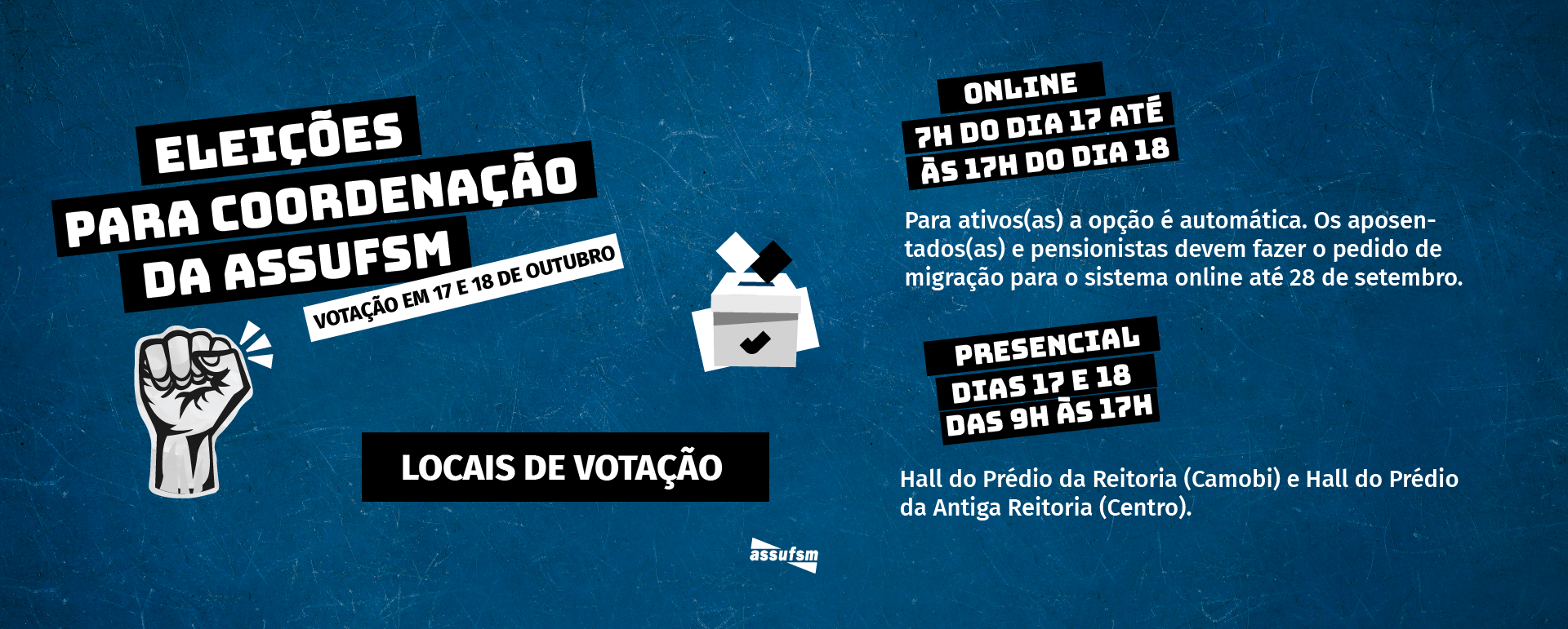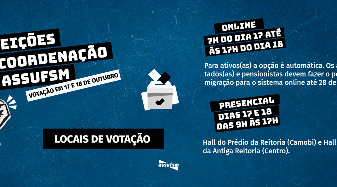 Além disso, os locais de votação presencial (APENAS para aposentados, aposentadas e pensionistas que NÃO migrarem para o sistema online) serão: