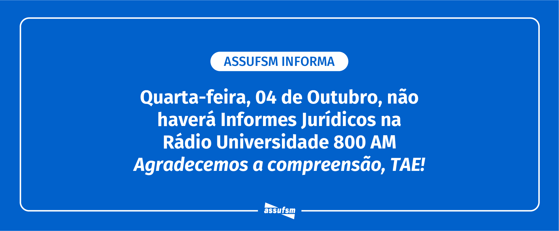 No dia 3 de outubro, a Assufsm determinou paralisação, por tanto, não teremos programa de rádio. Além disso, o programa jurídico também não será apresentado, excepcionalmente, nessa semana, para a realização das apresentações das chapas.