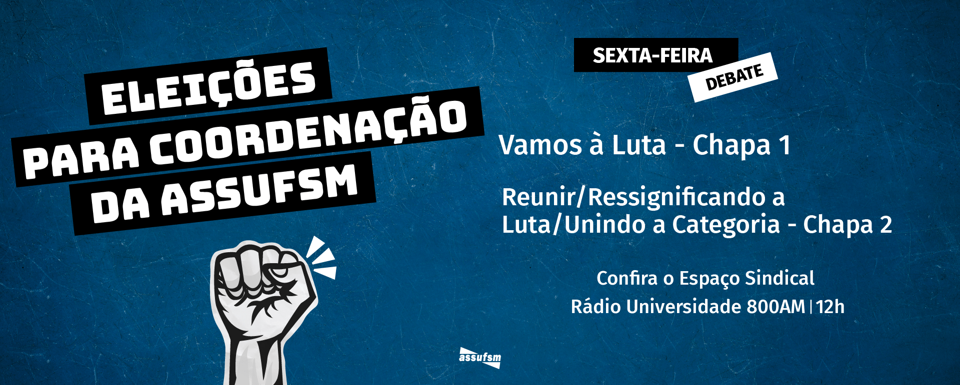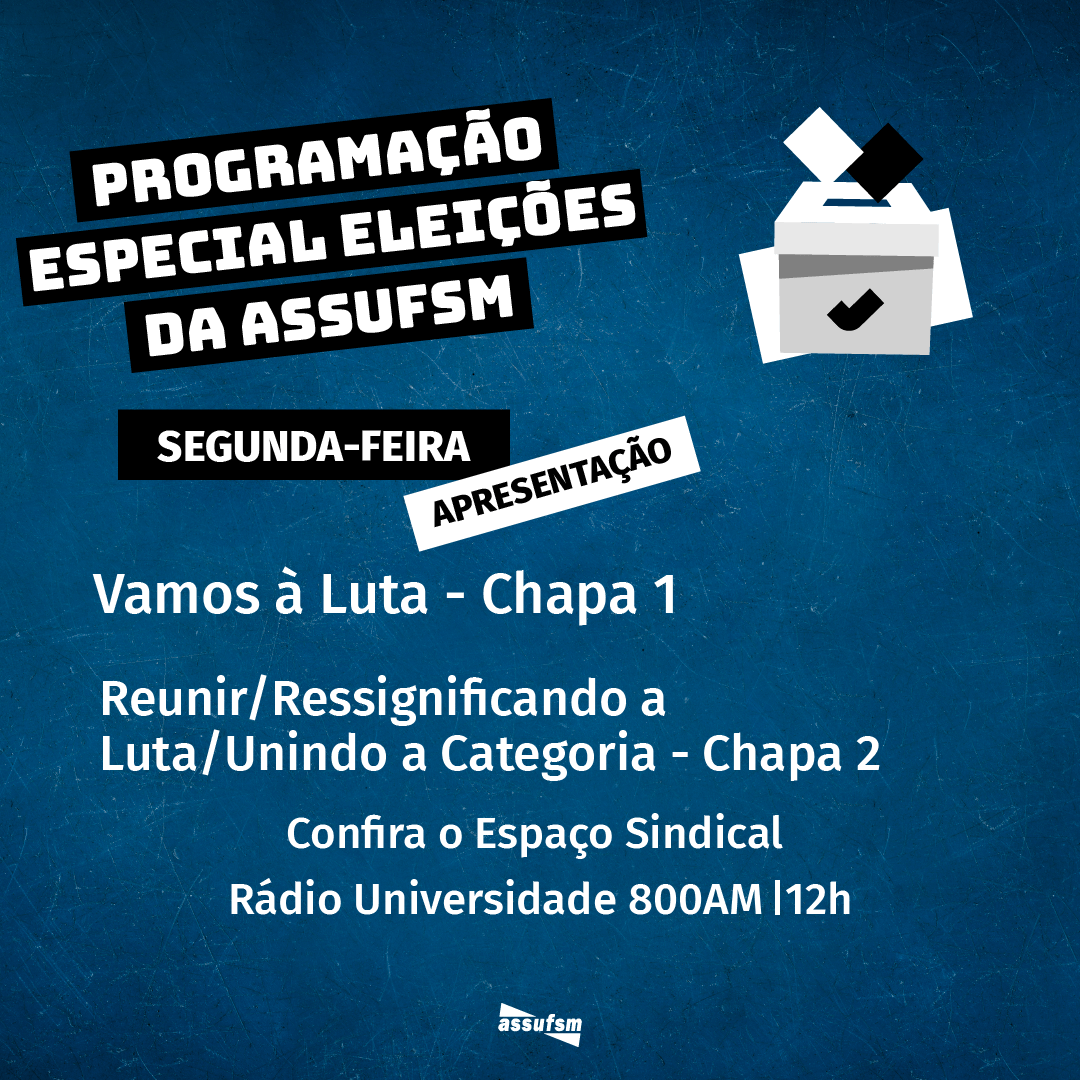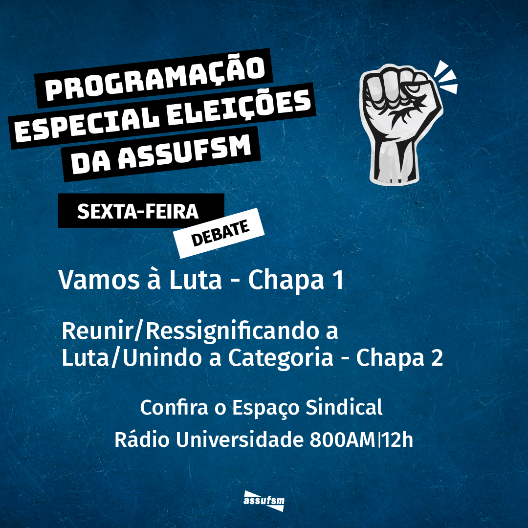 O Espaço Sindical da Assufsm será um pouco diferente na próxima semana. Isso porque as chapas inscritas para concorrerem a eleição de 2023 vão se apresentar. O dia do debate será em 6 de outubro, às 12h, nas ondas da 800 AM e também pelo facebook da Assufsm.