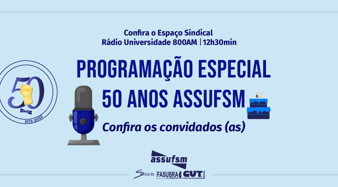 Na semana em que a Assufsm completou 50 anos de muitas lutas e conquistas, o setor de Comunicação realizou uma programação especial no Espaço Sindical, programa que vai ao ar de segunda a sexta-feira nos 800AM da Rádio Universidade, às 12h30min. Ao longo da semana, participaram convidados e convidadas especiais que compartilharam um pouco de suas histórias junto ao Sindicato.