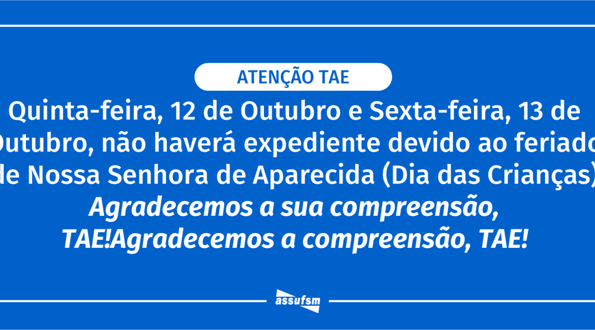 TAE, atenção. Nos dias 12 e 13 de outubro, a Assufsm não terá expediente devido ao feriado do Dia de Nossa Senhora Aparecida e Dia das Crianças, conforme calendário acadêmico estabelecido pela Universidade Federal de Santa Maria (UFSM).