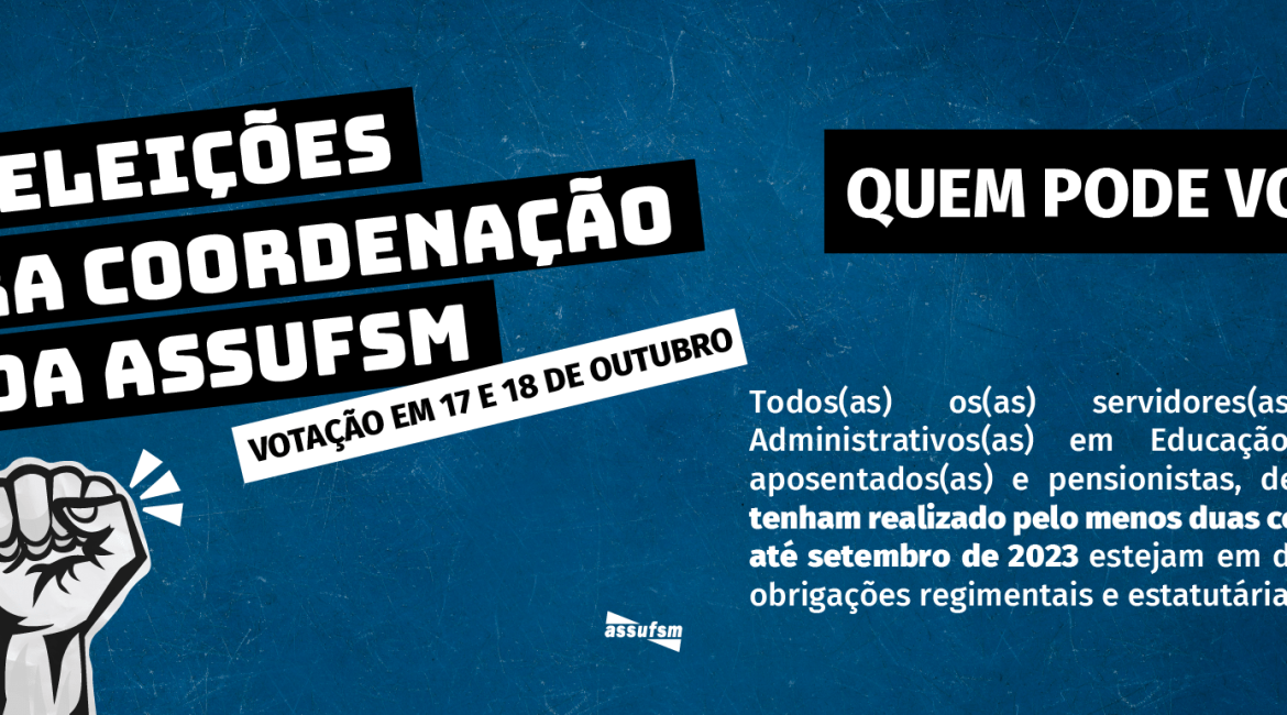 “São eleitores(as), todos(as) os(as) servidores(as) técnico-administrativos(as) em educação, incluindo aposentados(as), pensionistas, desde que já tenham realizado pelo menos duas contribuições até o mês de setembro de 2023, conforme alínea “a” do artigo 36 do Regimento Interno da ASSUFSM, o que em caso de dúvidas, deverão ser apresentados os contra cheques de julho e agosto de 2023 e que estejam em dia com suas obrigações regimentais e estatutárias, conforme regulamento eleitoral.“