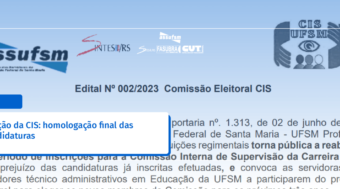 A Comissão Eleitoral, instituída por meio da Portaria Nº 1.313, de 02/06/2023, divulga a listagem das candidaturas homologadas para o processo eleitoral de escolha dos novos membros da Comissão Interna de Supervisão (CIS) do Plano de Carreira dos Cargos Técnico-Administrativos em Educação da UFSM. Houve um acréscimo de nome em relação à publicação anterior: