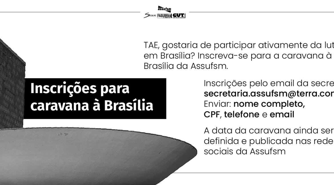 Para se inscrever na caravana, envie um e-mail para a secretaria: secretaria.assufsm@terra.com.br, deixando seu nome completo, CPF, contato telefônico e e-mail. As inscrições não tem prazo para encerrar, por enquanto, pois a caravana está com data a ser decidida, devido a reunião da mesa ter sido reagendada pelo governo.