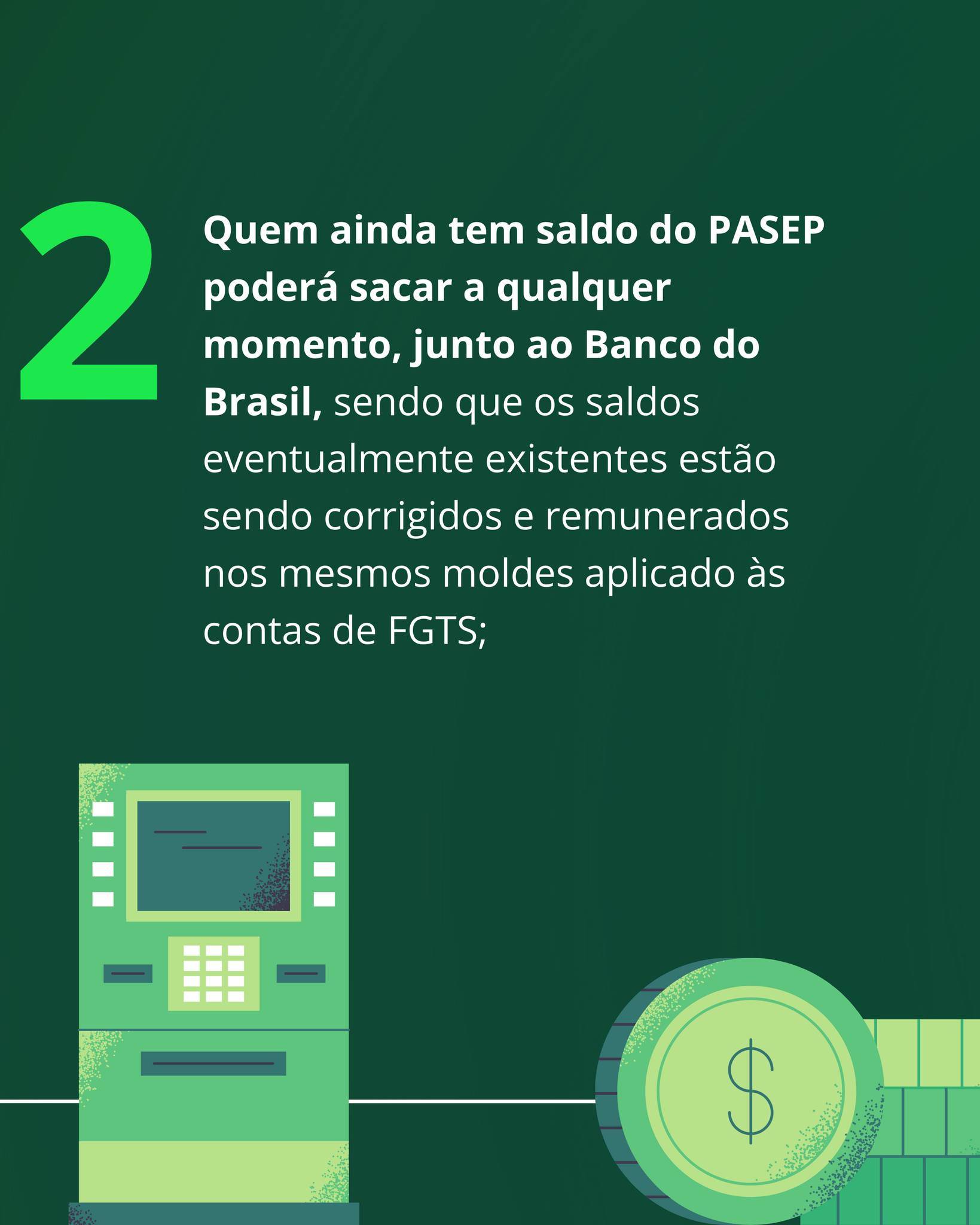 2. Quem ainda tem saldo do PASEP poderá sacar a qualquer momento, junto ao Banco do Brasil, sendo que os saldos eventualmente existentes estão sendo corrigidos e remunerados nos mesmos moldes aplicado às contas de FGTS;