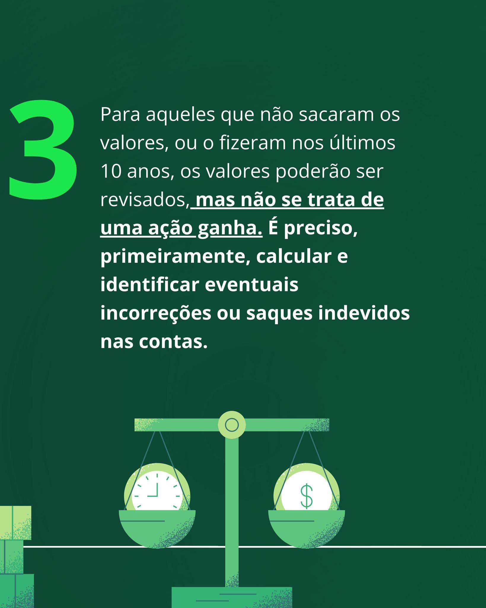 3. Para aqueles que não sacaram os valores, ou o fizeram nos últimos 10 anos, os valores poderão ser revisados, mas não se trata de uma ação ganha. É preciso, primeiramente, calcular e identificar eventuais incorreções ou saques indevidos nas contas.