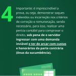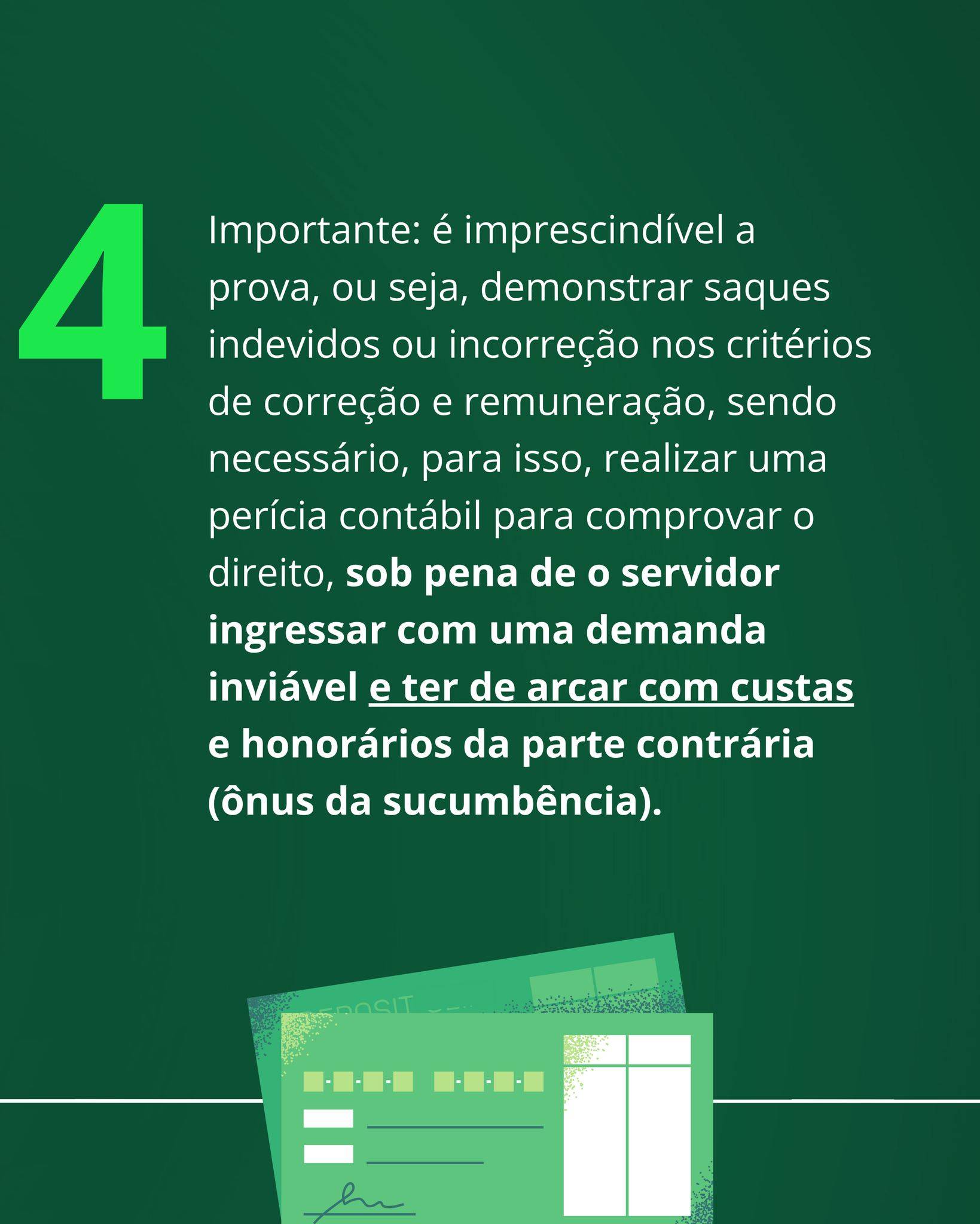 4. Importante: é imprescindível a prova, ou seja, demonstrar saques indevidos ou incorreção nos critérios de correção e remuneração, sendo necessário, para isso, realizar uma perícia contábil para comprovar o direito, sob pena de o servidor ingressar com uma demanda inviável e ter de arcar com custas e honorários da parte contrária (ônus da sucumbência).
