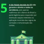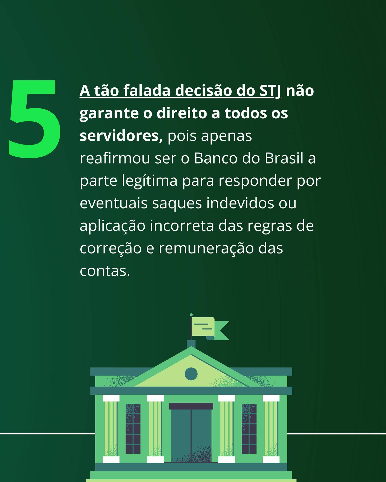 5. A tão falada decisão do STJ não garante o direito a todos os servidores, pois apenas reafirmou ser o Banco do Brasil a parte legítima para responder por eventuais saques indevidos ou aplicação incorreta das regras de correção e remuneração das contas.