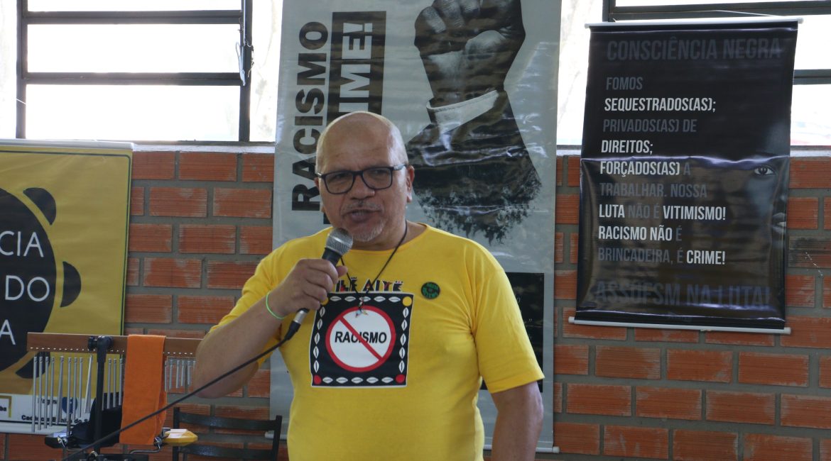 Em seguida, o coordenador geral Ciro Oliveira destacou o histórico de lutas da Assufsm pela equidade e igualdade racial, citando as ações combativas do GT Raça e Etnia e de colegas como o TAE já falecido Onofre Caetano Macedo, um dos servidores fundadores da Assufsm.