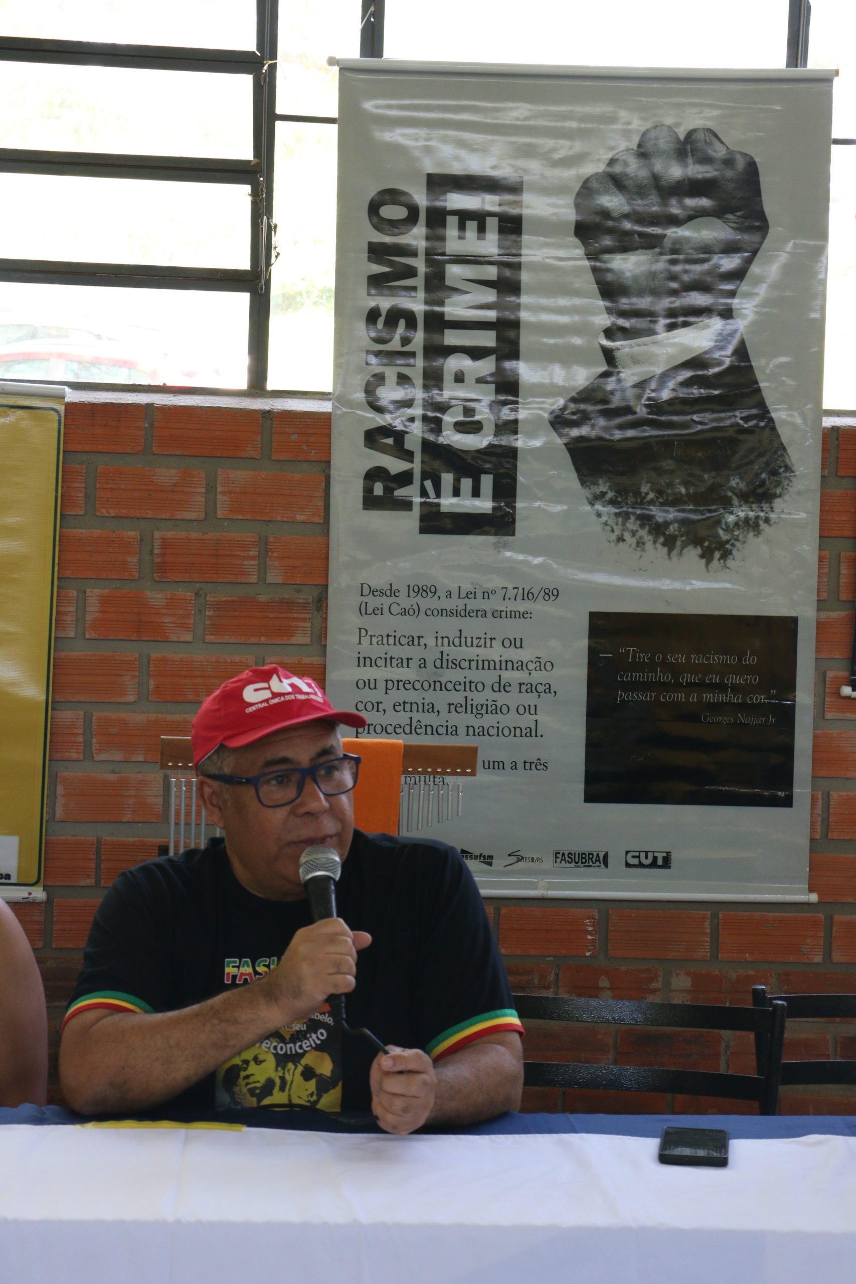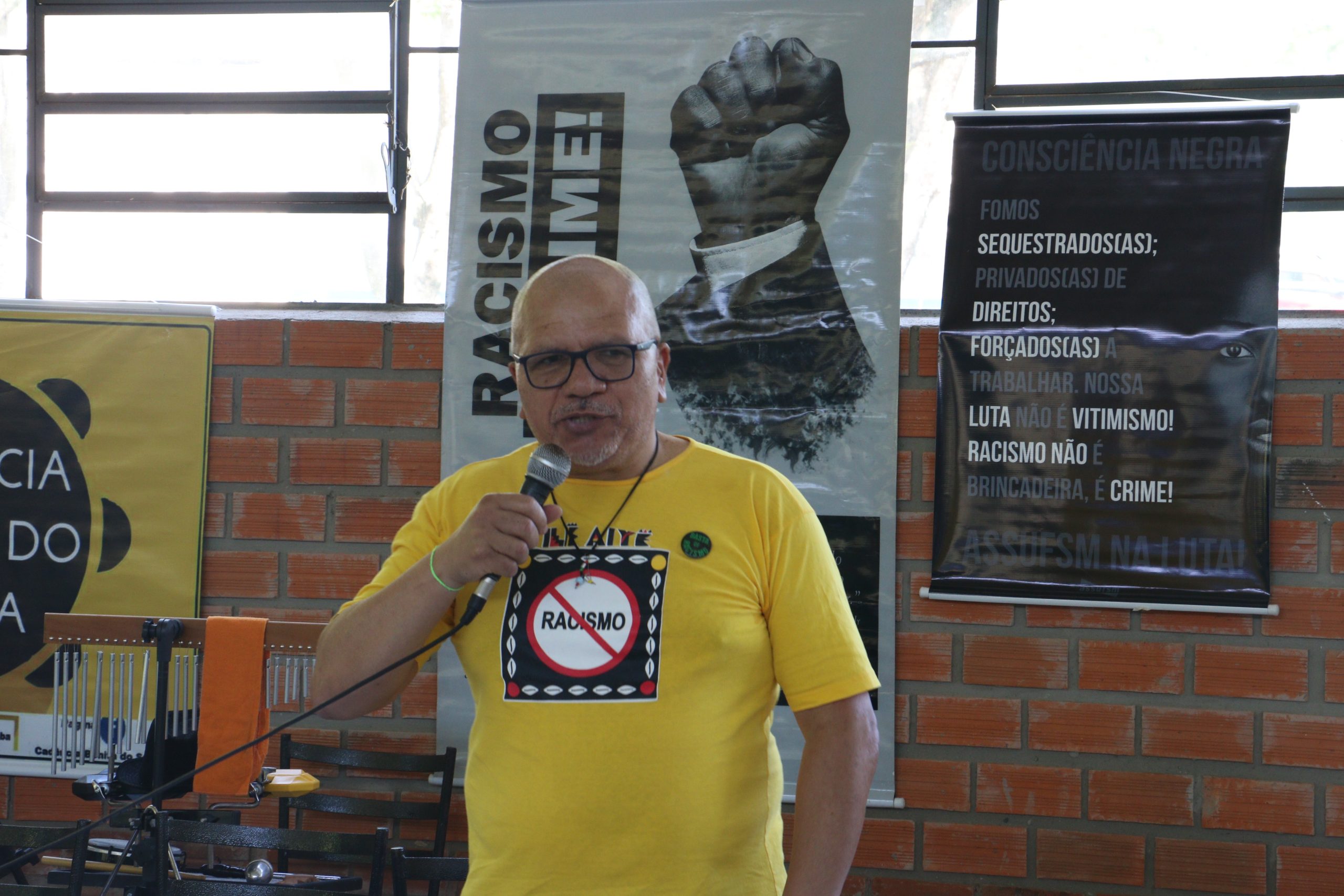 Em seguida, o coordenador geral Ciro Oliveira destacou o histórico de lutas da Assufsm pela equidade e igualdade racial, citando as ações combativas do GT Raça e Etnia e de colegas como o TAE já falecido Onofre Caetano Macedo, um dos servidores fundadores da Assufsm.