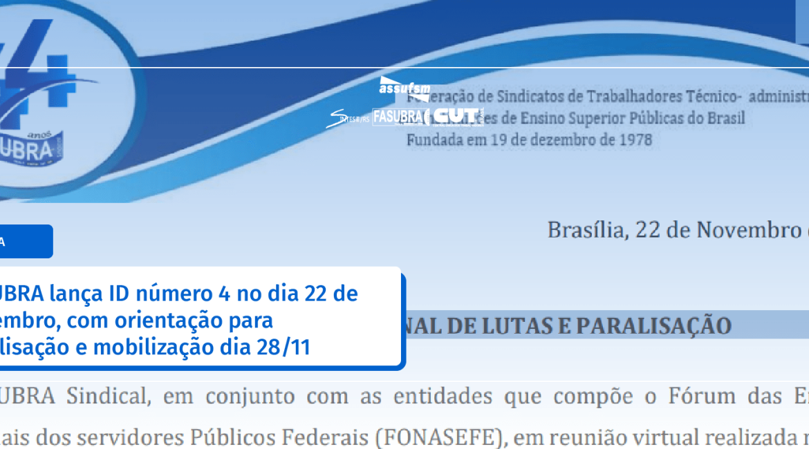 FASUBRA lança ID número 4 no dia 22 de novembro, com orientação para paralisação e mobilização dia 28/11
