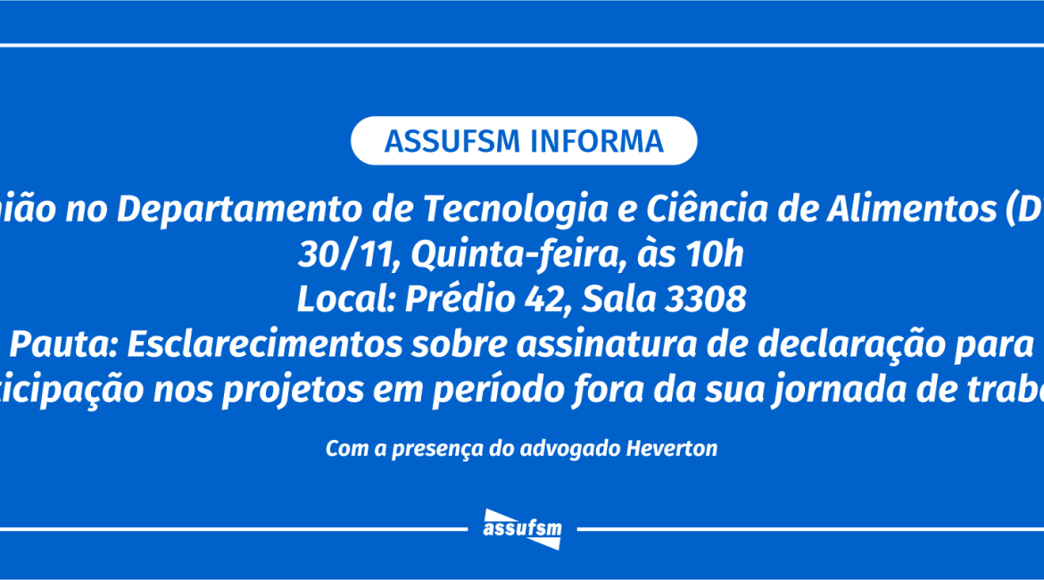 A Assufsm realizará, nessa quinta-feira, dia 30 de novembro, mais uma setorial com o Departamento de Tecnologia e Ciência de Alimentos (DTCA), da Universidade Federal de Santa Maria.