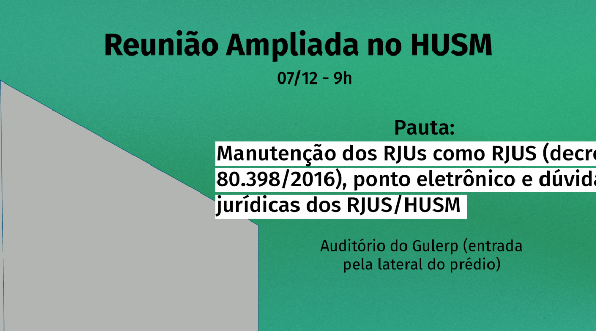 Atenção TAE do HUSM, no dia 7 de dezembro, às 9h, no Auditório do Gulerp, a Assufsm terá uma Reunião Ampliada com a categoria e a PROGEP para debater assuntos pertinentes a esse grupo.