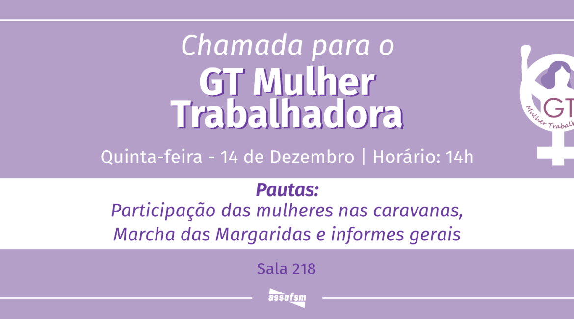 O GT Mulheres Trabalhadoras da Assufsm acontece no próximo dia 14 de dezembro, às 14h, na Sala 218, no segundo andar do prédio da Reitoria.