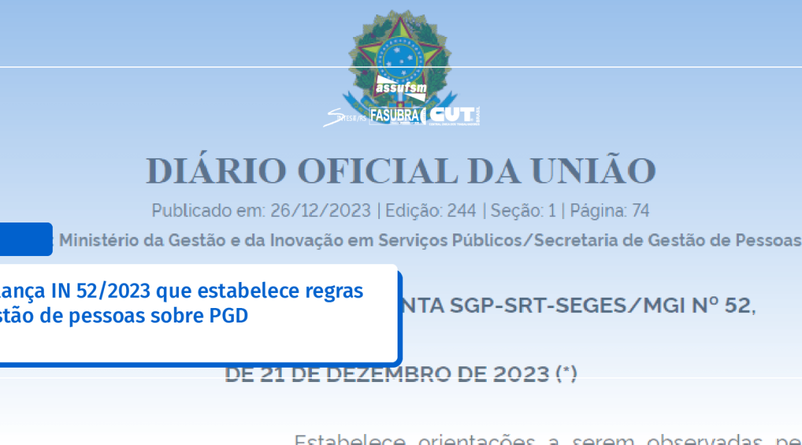 Foi republicada no Diário Oficial da União de terça-feira, dia 26/12/2023, a Instrução Normativa Conjunta SGP-SRT-SEGES/MGI nº 52/2023, de 21 de dezembro de 2023, que havia sido publicada originalmente no dia 22/12. O texto estabelece orientações a respeito das regras de gestão de pessoas no âmbito do Programa de Gestão e Desempenho (PGD) que devem ser observadas pelos órgãos e entidades integrantes do Sistema de Pessoal Civil da Administração Federal (Sipec) e do Sistema de Organização e Inovação Institucional do Governo Federal (Siorg). Não houver qualquer mudança de orientação: na republicação consta anexo não presente na publicação original.