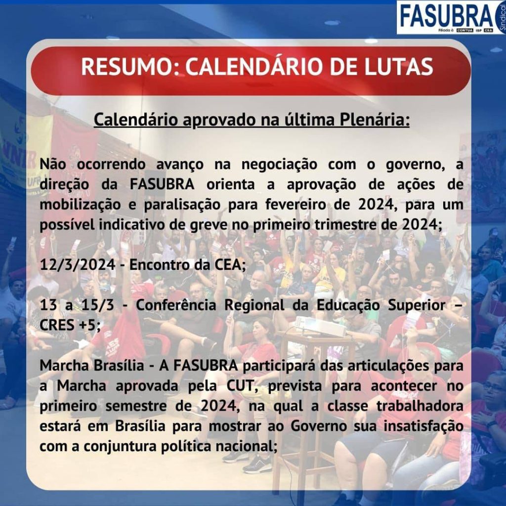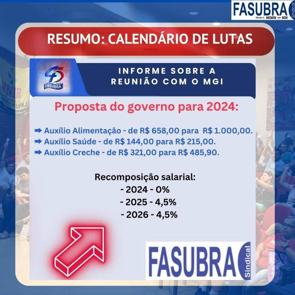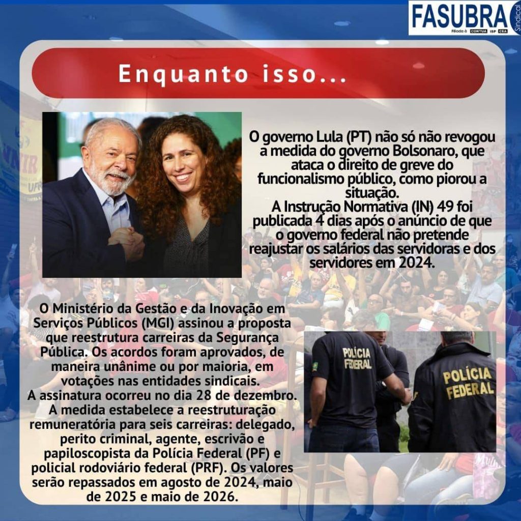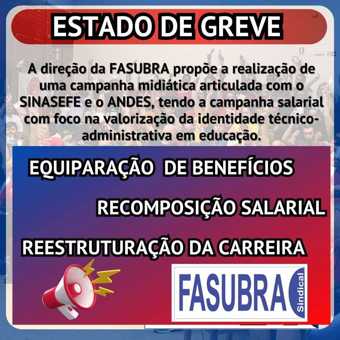 FASUBRA lança informes sobre estado de Greve do Funcionalismo Público Em GeralPostou 08/01/2024 Em cards para as mídias digitais, a FASUBRA lançou informes sobre o estado de greve do Funcionalismo Público e como se chegou até esse momento. Confira, abaixo, o resumo dos fatos: Cards e informações: FASUBRA