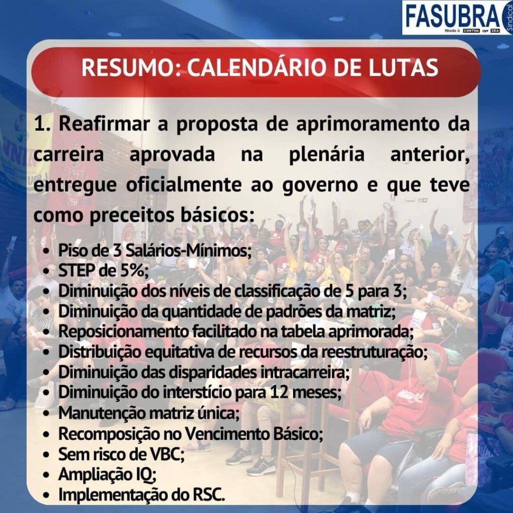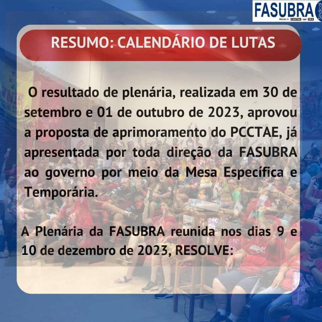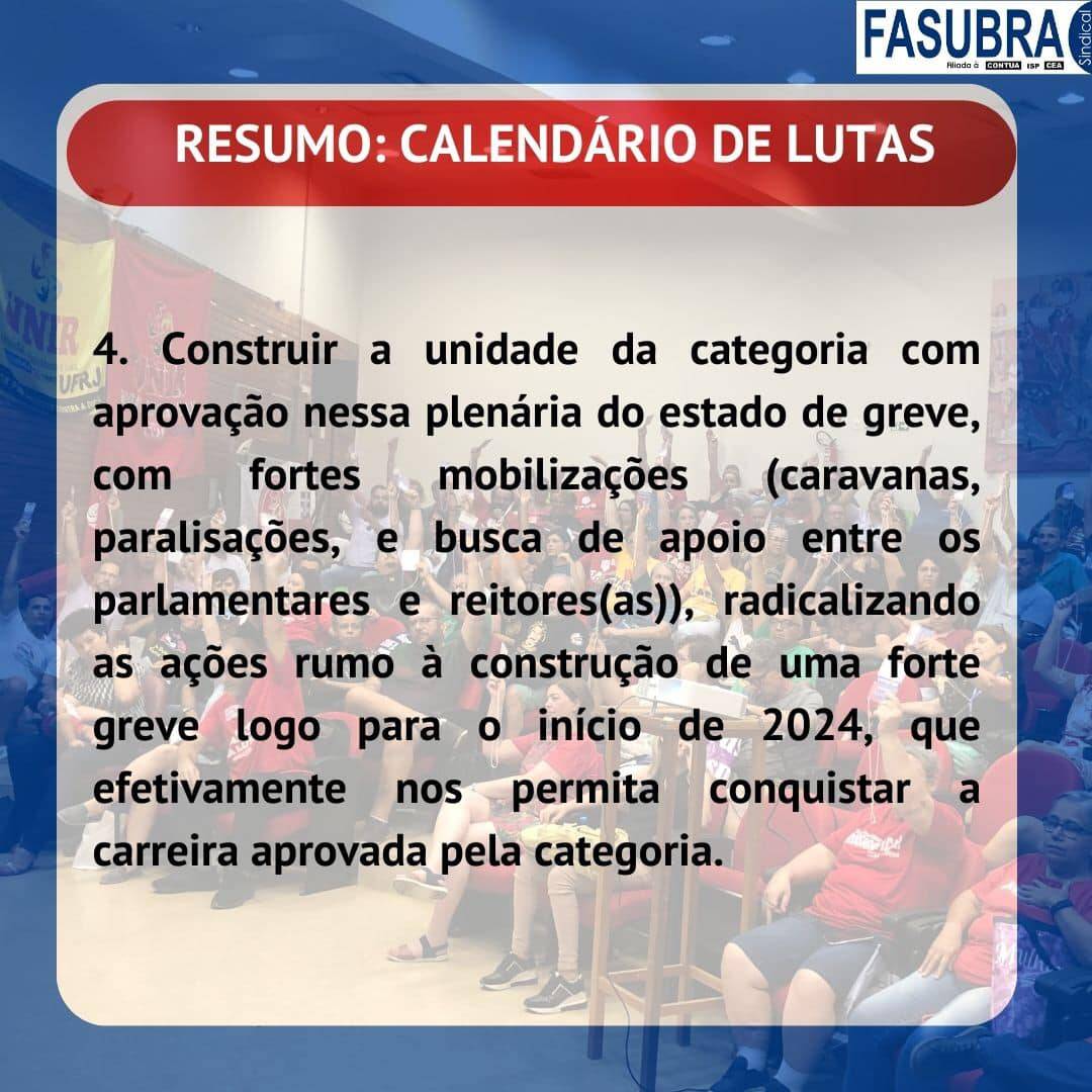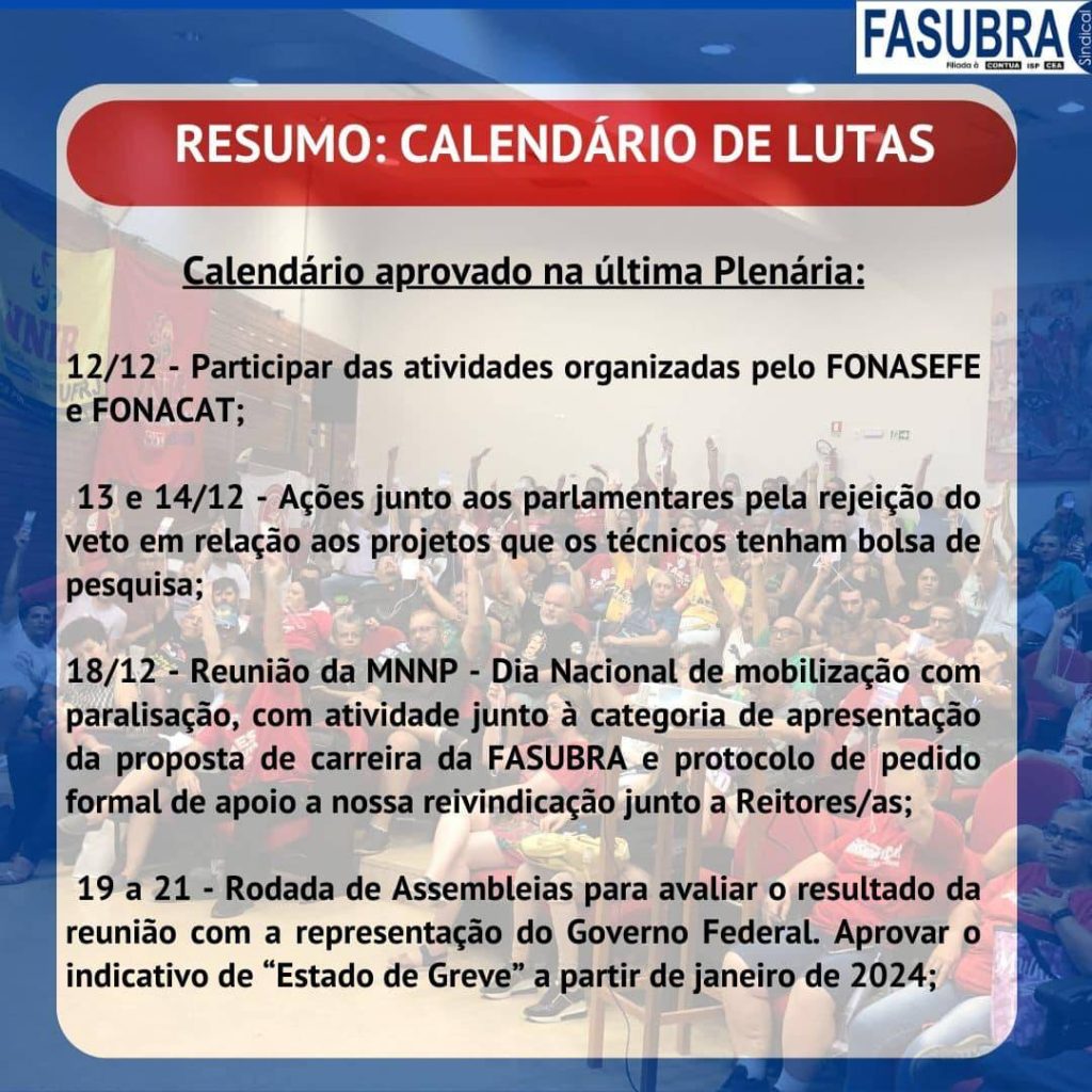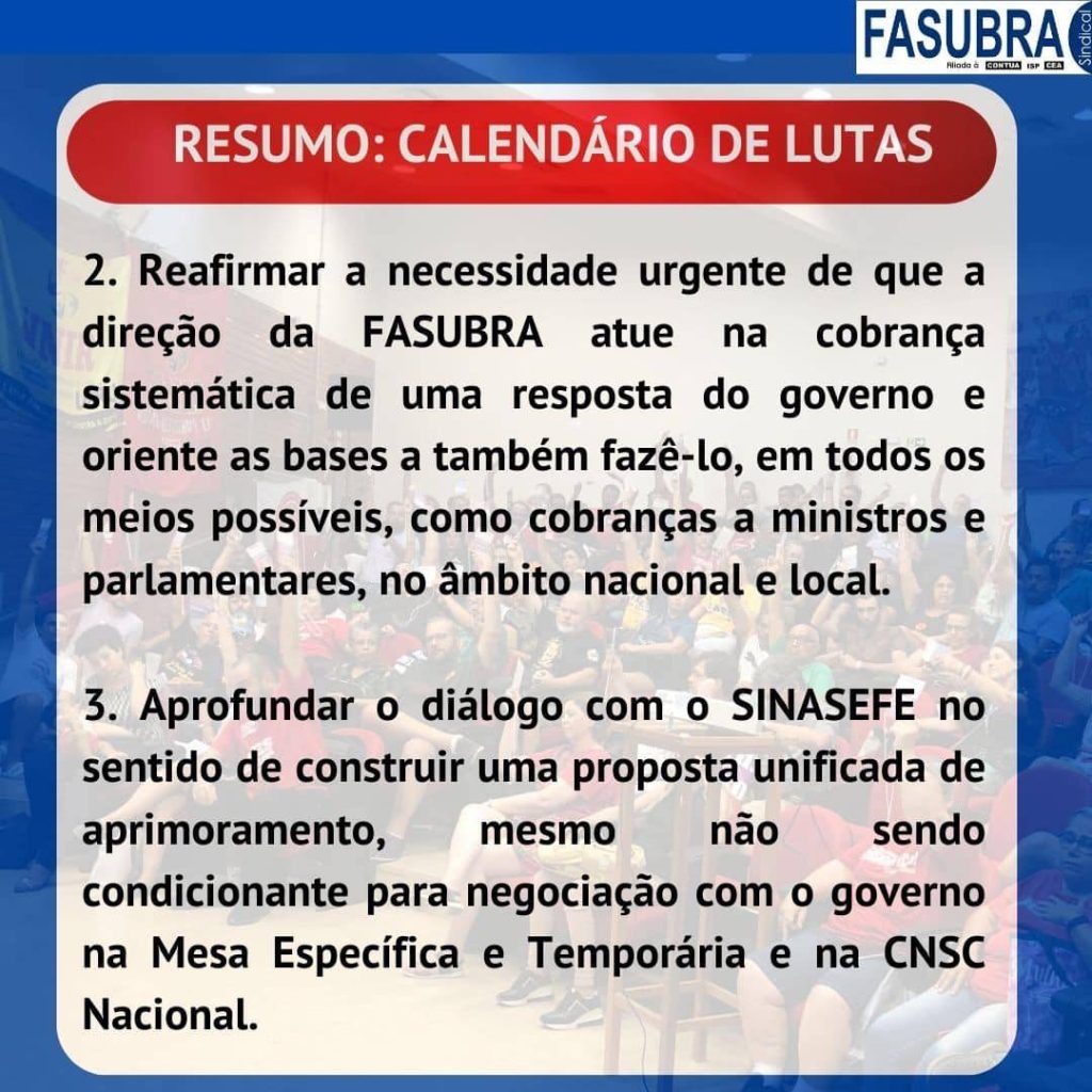 FASUBRA lança informes sobre estado de Greve do Funcionalismo Público Em GeralPostou 08/01/2024 Em cards para as mídias digitais, a FASUBRA lançou informes sobre o estado de greve do Funcionalismo Público e como se chegou até esse momento. Confira, abaixo, o resumo dos fatos: Cards e informações: FASUBRA