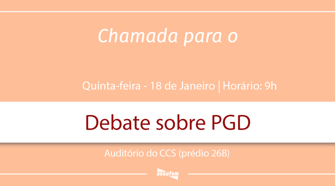 ATENÇÃO TAE da UFSM, o GT PGD da Assufsm acontece no próximo dia 18 de janeiro, às 9h, no Auditório do CCS, no prédio 26B.