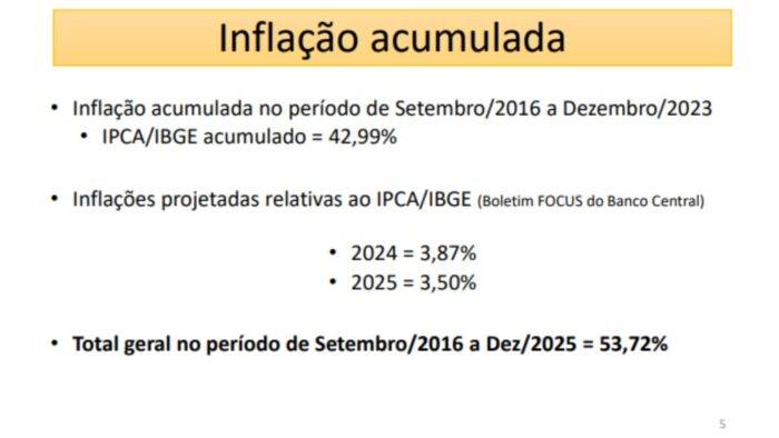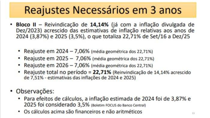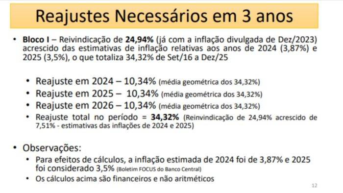 A contraproposta é de que sejam três parcelas (2024/25/26) de 10,34%, incluindo as perdas de 24,94% mais a inflação presumida para os próximos dois anos.