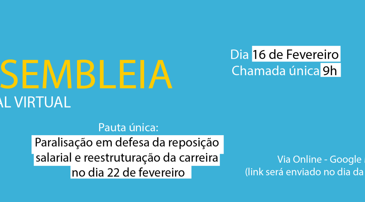 No dia 16 de fevereiro, sexta-feira, às 9h, via Google Meet, a Assufsm realizará Assembleia Geral Virtual da categoria. Em pauta, está o debate sobre a paralisação em defesa da reposição salarial e reestruturação da carreira no dia 22 de fevereiro, data que o MGI convocou nova reunião da Mesa Nacional de Negociação Permanente.